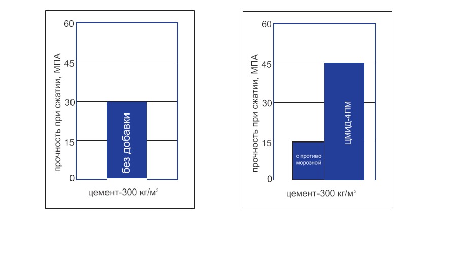 ЦМИД-4ПМ – добавка комплексного действия, с четко выверенными пропорциями применяемых компонентов, и не требует введения с бетонную смесь дополнительных добавок.